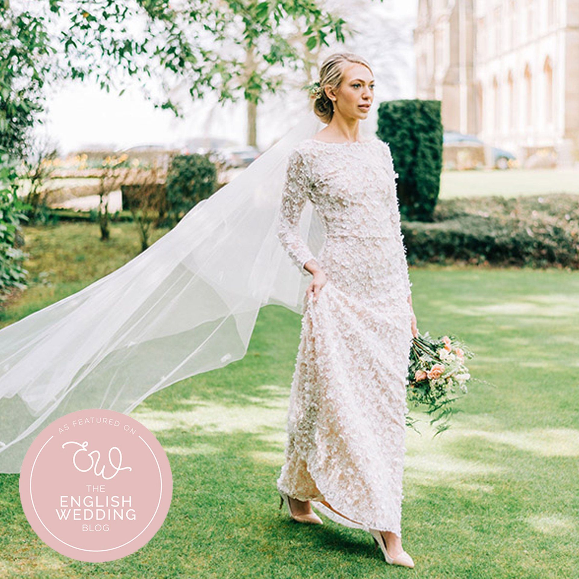 Beautiful soft coral toned photoshoot featured in English Wedding blog with our "Elopement" stretch lace dress.