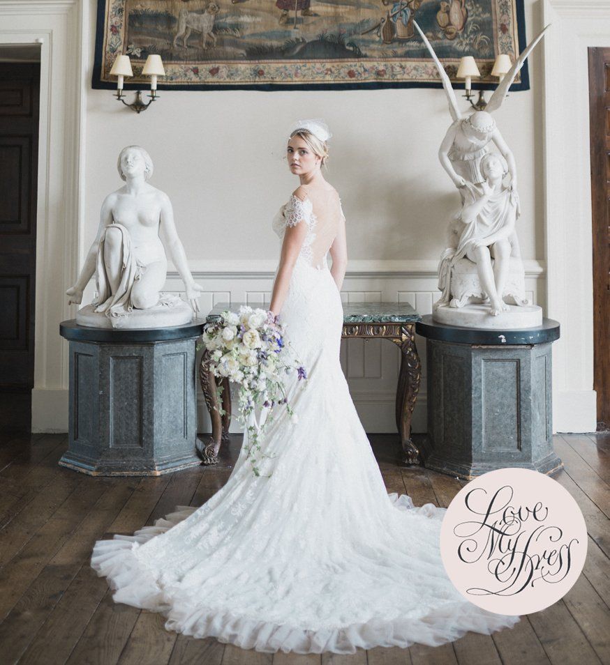 A wonderful styled wedding photoshoot in pearl and lavender tones showcasing a stunning lace and tulle dress by us.