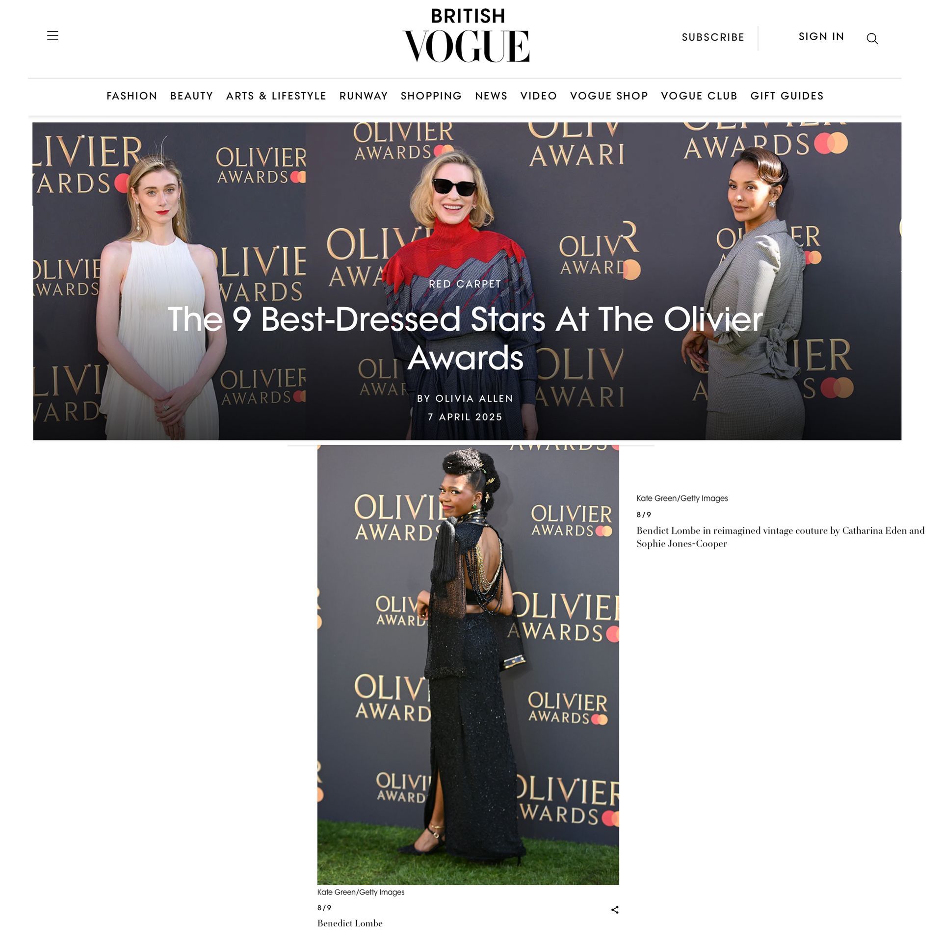 Re imagined couture picked out as 1 out of 9 best dressed at the 2025 Olivier Awards
