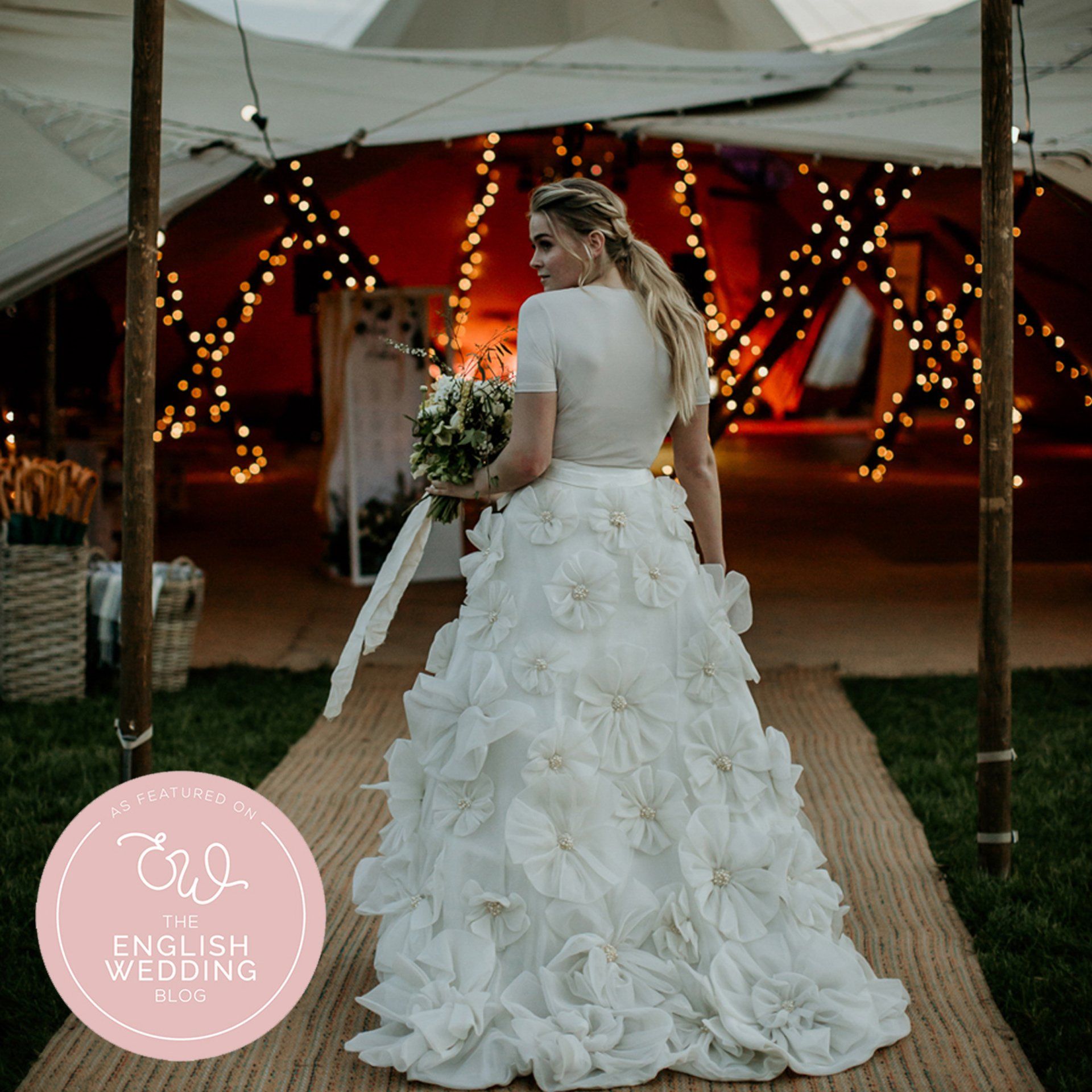 A tipi styled shoot featuring our extravagant detachable flower train. Published in English Wedding blog.