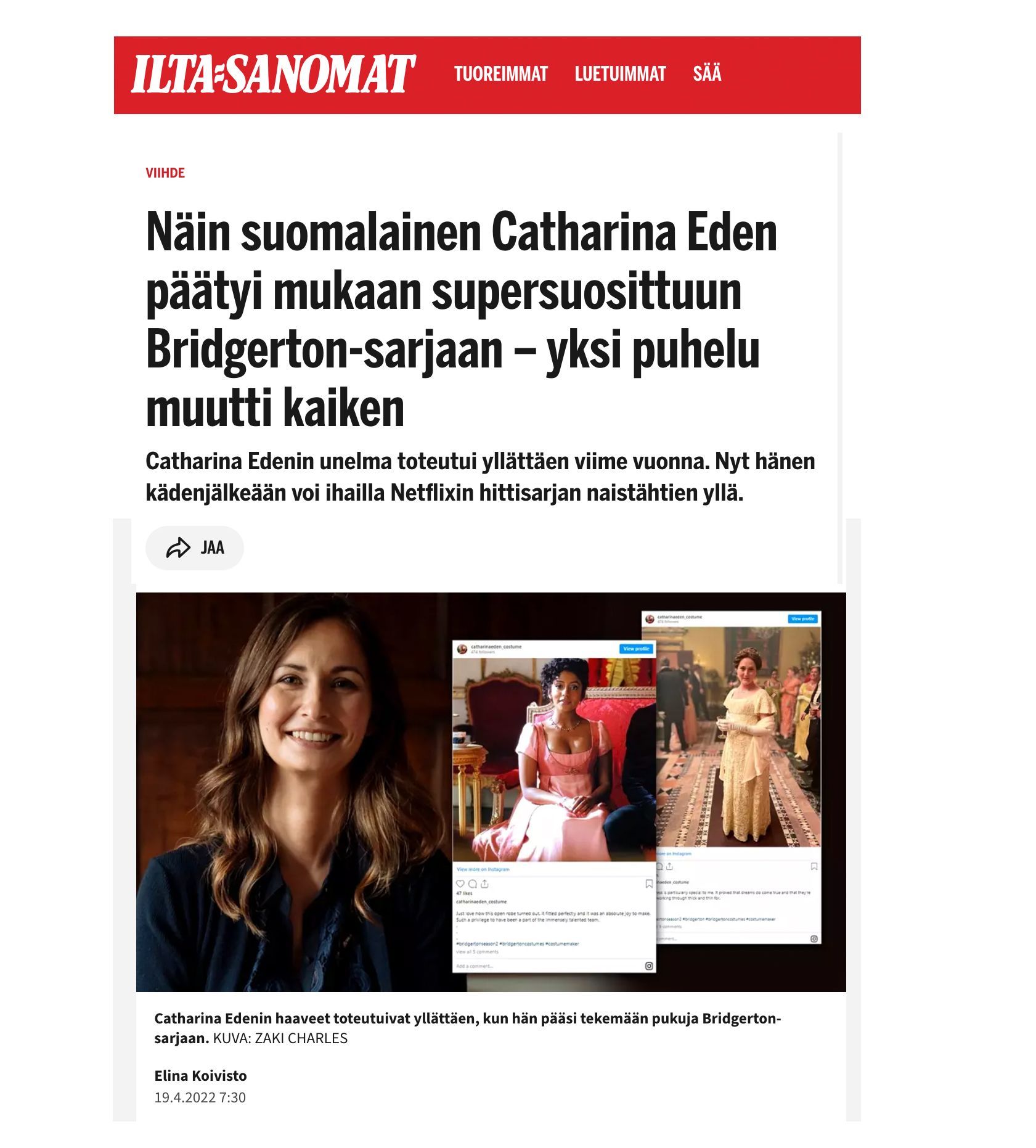 Working as a costume maket for Bridgerton on season 2 made the news in Finland